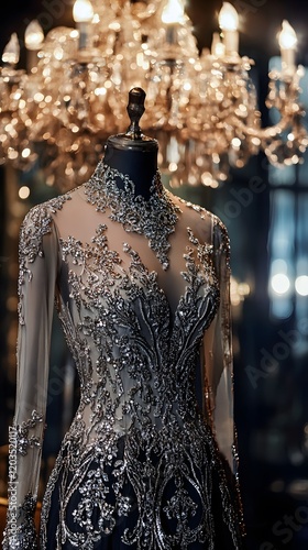 Fototapeta premium 10. A luxurious evening dress with intricate beadwork, in front of a glamorous chandelier