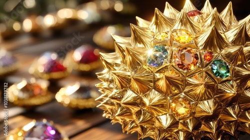 Naklejka premium A luxurious graphic of a gold durian with sparkling gemstone thorns, each thorn radiating a different color, symbolizing wealth and opulence