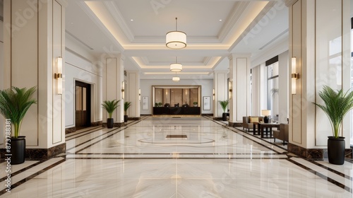 © Paul, Fototapeta premium A luxurious hotel lobby with a concierge assisting a guest, intricate marble flooring, plush seating, and elegant lighting enhancing the ambiance