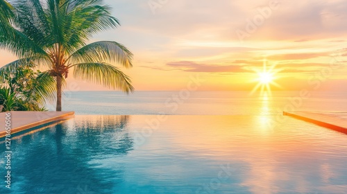 Fototapeta premium A luxurious infinity pool overlooking the ocean, reflecting the golden hues of a tropical sunset, serene summer vacation background with copy space.