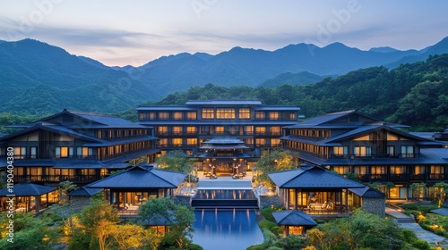 © Pannee, Naklejka premium A luxurious Japanese resort featuring a private hot spring bath in the garden.