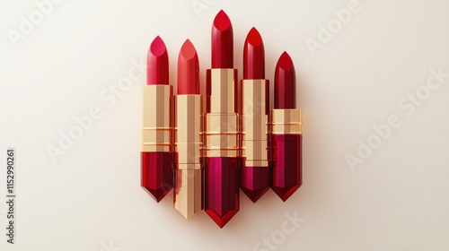Obraz premium A luxurious layout of seven lipsticks in red and rose hues, their golden accents forming a geometric arrangement on white