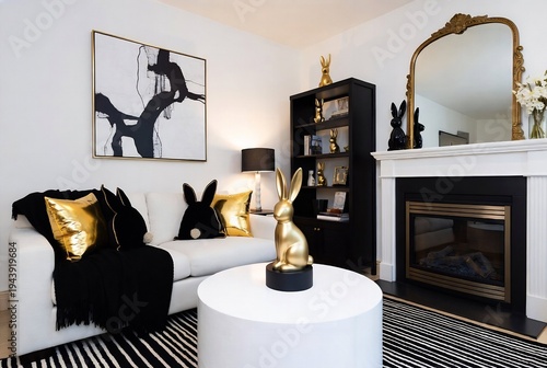 Fototapeta premium A luxurious living room with a black and white color scheme, featuring rabbit decor and a fireplace.
