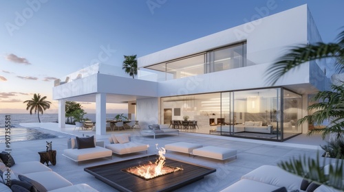 © Muhammad, Fototapeta premium A luxurious modern beachfront villa with a white exterior, large sliding glass doors, and an outdoor lounge area with a fire pit and ocean view.