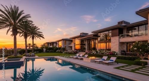 © SOEM, Obraz premium A luxurious modern mansion with a pool and palm trees at sunset.