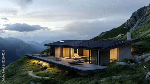 Naklejka premium A luxurious mountain residence equipped with solar panels, offering an energy-efficient solution while providing stunning mountain views.