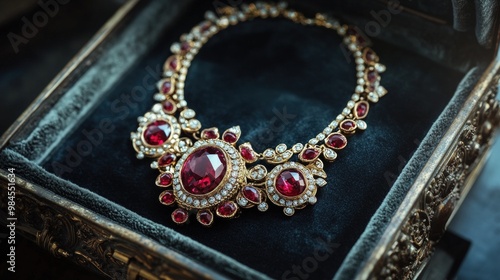 © Lexyat, Obraz premium A luxurious ruby necklace with gold accents rests inside a velvet-lined box.