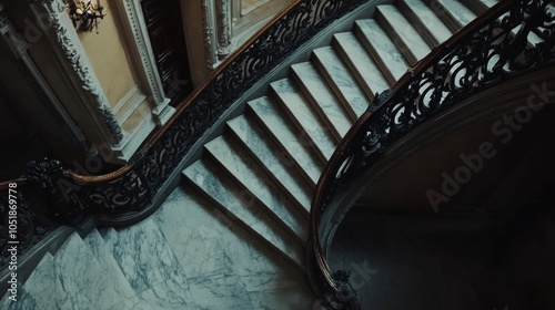 © Intach, Fototapeta premium A luxurious staircase seen from above, with gleaming marble steps and ornate wrought iron detailing. Open space on the left for promotional captions