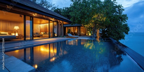 © bird_saranyoo, Obraz premium A luxurious villa illuminated at dusk, featuring large glass windows and an infinity pool