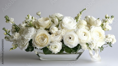 Obraz premium A luxurious white rose arrangement with ribbons and soft flowers, creating...