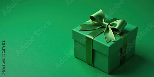 Obraz premium A luxuriously wrapped emerald green gift box, adorned with a matching satin ribbon and bow, rests elegantly on a coordinating backdrop.