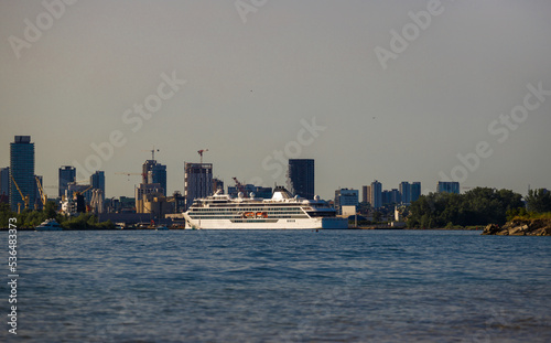 Fototapeta premium A luxury cruise ship docks in port at sunset. Passenger vessel Travels