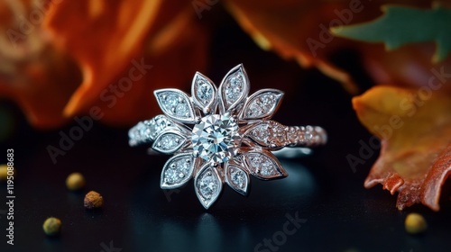 Fototapeta premium A luxury diamond ring with a floral-inspired design rests on a dark surface,...