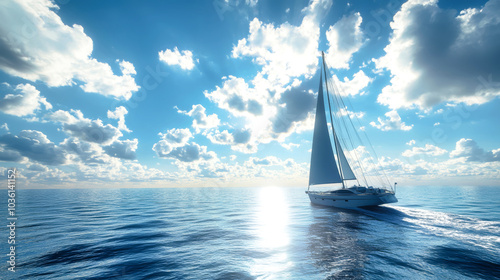 Fototapeta premium A luxury yacht elegantly races across the open sea beneath a vibrant blue sky adorned with fluffy white clouds on a sunny day