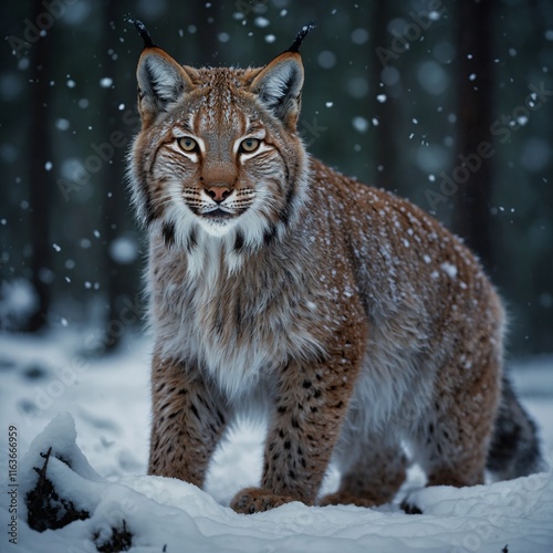 © atif, Obraz premium A lynx cub with glowing neon fur prowling in the forest, with blurred snowfall.