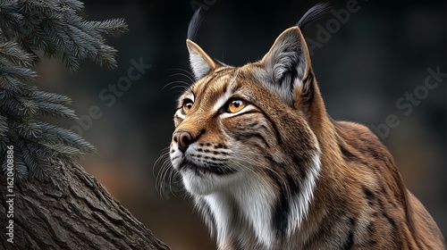 © Ghazala, Fototapeta premium A lynx gazing from behind ferns in a shadowy forest area, soft background blur and high detail on the lynxa??s fur and eyes