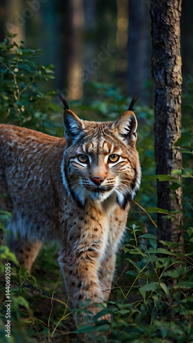Fototapeta premium A lynx quietly stalking its prey through dense underbrush in a twilight forest.