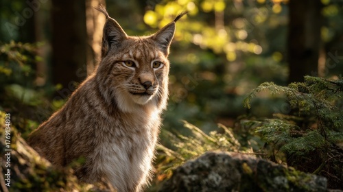 Obraz premium A lynx sits gracefully among the trees bathed in warm evening light and...