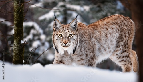 Naklejka premium A lynx with tufted ears and spotted coat stealthily moves through snowy...