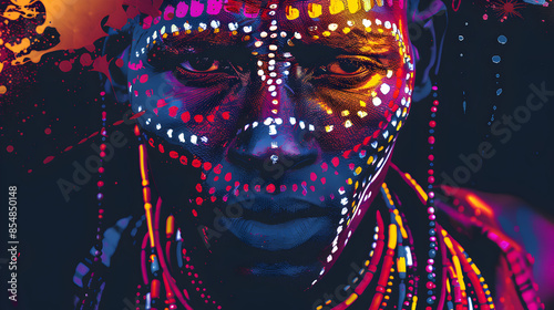 Naklejka premium A Maasai warrior painted in bright colors, adorned with beads, illustration.