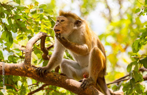 © Vera, Naklejka premium A macaque monkey sits on a tree in the jungle. Wildlife scene with wild animals.
