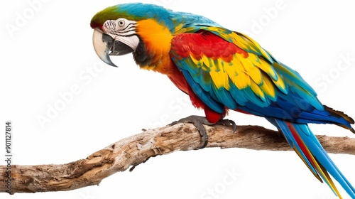 Fototapeta premium A macaw perched on a branch, feathers in full display, isolated on a neutral white background, ideal for adding text