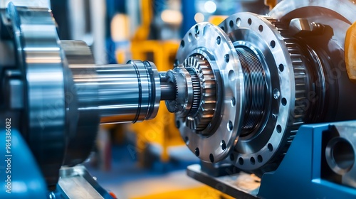 © jiraphat, Fototapeta premium A machine is being worked on with a blue and yellow background. The machine is a gear and has a lot of metal parts