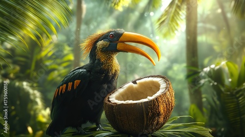 Obraz premium A macro image of a hornbill drinking from a cracked coconut, jungle light streaming in with green palm trees behind.