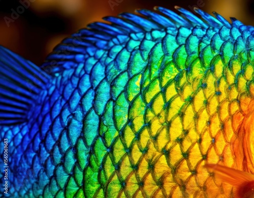 © Sergey, Obraz premium A macro image showing vivid geometric patterns on tropical fish scales.