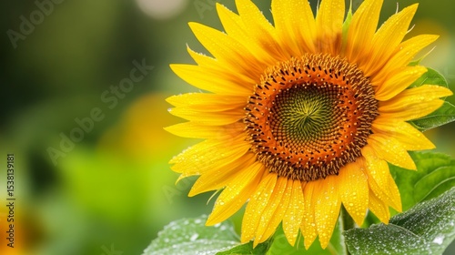 Fototapeta premium A macro shot of a bright yellow sunflower with morning dew on its petals,...