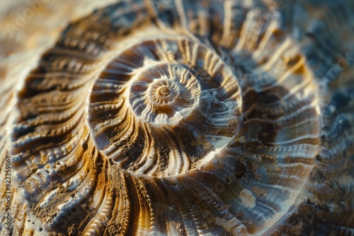 Obraz premium A macro shot reveals the fascinating spiral patterns and textures on a prehistoric fossilized shell