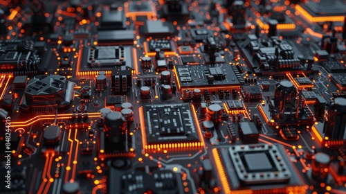 © Khalida, Obraz premium A macro view of a futuristic electronic circuit board with microchips and processors is rendered in 3D serving as a technology background concept