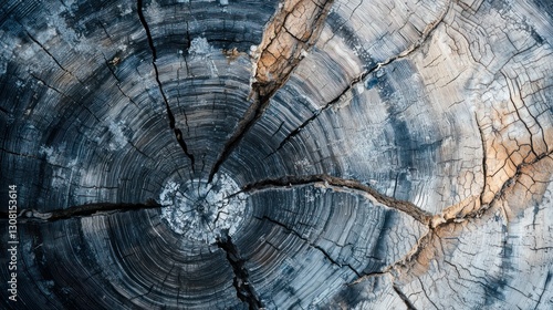 © Radetdararith, Fototapeta premium A macro view of tree rings with cracks and textures, showing age and growth patterns.