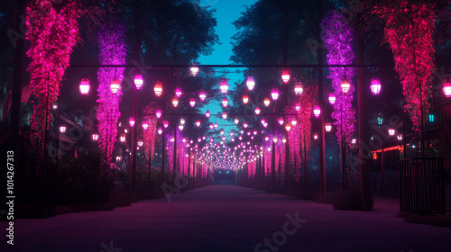 Fototapeta premium A magical alleyway illuminated with vibrant pink and purple lights.