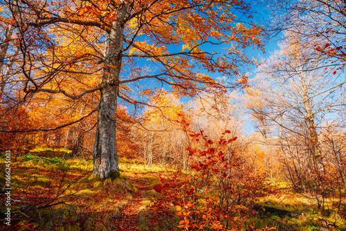 Fototapeta premium A magical autumn forest with multi-colored beech trees lit by the sun. Discovery the beauty of earth.