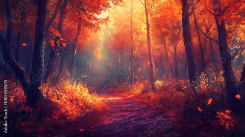 © Thirawat, Naklejka premium A magical autumn path in a serene forest, where the fiery hues of fall colors create an enchanting and peaceful setting for a relaxing walk
