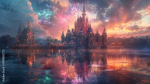 Fototapeta premium A magical castle illuminated by fireworks at sunset.