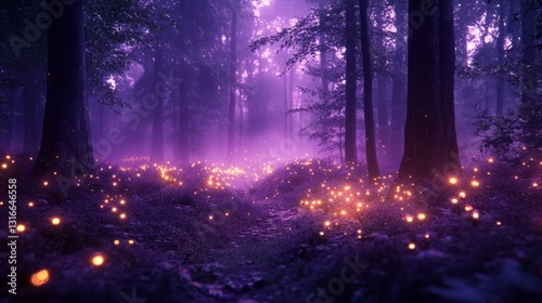© liliyabatyrova, Fototapeta premium A magical forest comes alive as countless fireflies sparkle amid lush greenery, casting a soft, enchanting glow under a vivid violet twilight sky. The atmosphere is serene and mystical
