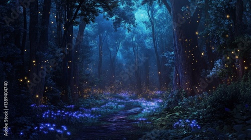 © wicha, Obraz premium A magical forest glowing with bioluminescent plants and fireflies at twilight