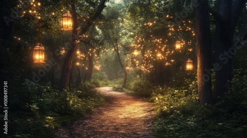 Obraz premium A magical forest pathway illuminated by warm lantern light at twilight,...