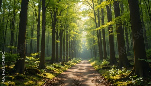 Naklejka premium A magical forest trail surrounded by vibrant green moss and tall trees under soft sunlight