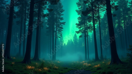 © Ernesto, Obraz premium A magical forest under vibrant auroras, with shimmering leaves and glowing wildflowers. Mystical mist and detailed textures create a serene, enchanting tribute to Earth.