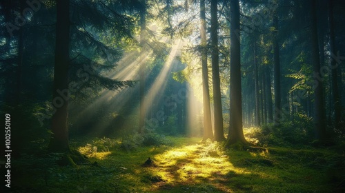 © Sampao, Fototapeta premium A magical forest with sunlight filtering through a dense canopy of tall trees, creating dramatic beams of light on the forest floor.