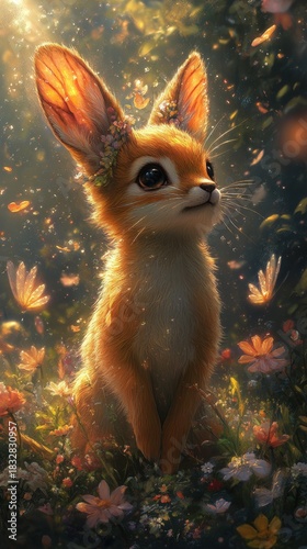 © Miramiska, Fototapeta premium A magical fox with luminous orange fur rests in a colorful flower field, bathed in a soft, warm light, creating an enchanting and ethereal scene.