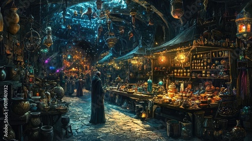 Obraz premium A magical market filled with mystical items, colorful lights, and enchanting...