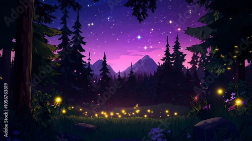 Fototapeta premium A magical nighttime forest scene with fireflies glowing among trees under a sky full of stars
