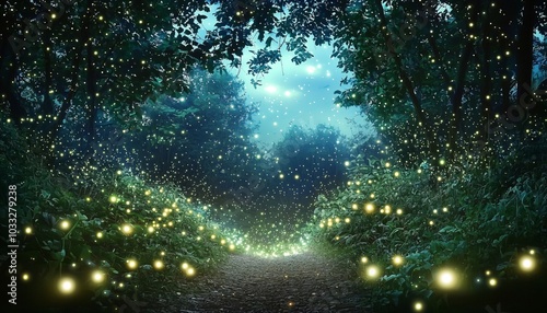 Obraz premium A Magical Nighttime Scene of Fireflies in a Forest Pathway