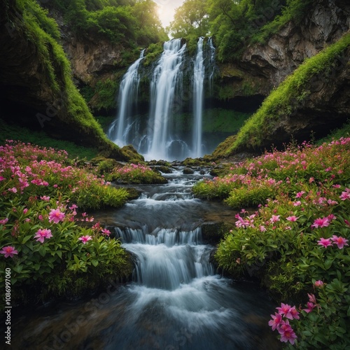 © Dogfeeding1997, Obraz premium A magical valley where flowers bloom in cascading waterfalls.
