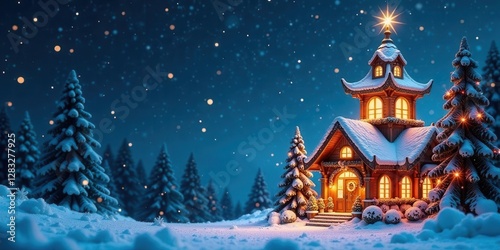 © Angel Pic, Fototapeta premium A Magical Winter Night Scene Featuring a Cozy Snow-Covered House with Warm Glowing Lights and a Star on Top, Surrounded by Snowy Evergreen Trees Under a Sparkling Night Sky