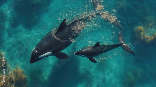 Obraz premium a magnificent baby killer whale swimming closely beside its mother captured in a heartwarming closeup highlighting the bond between them in the clear blue ocean